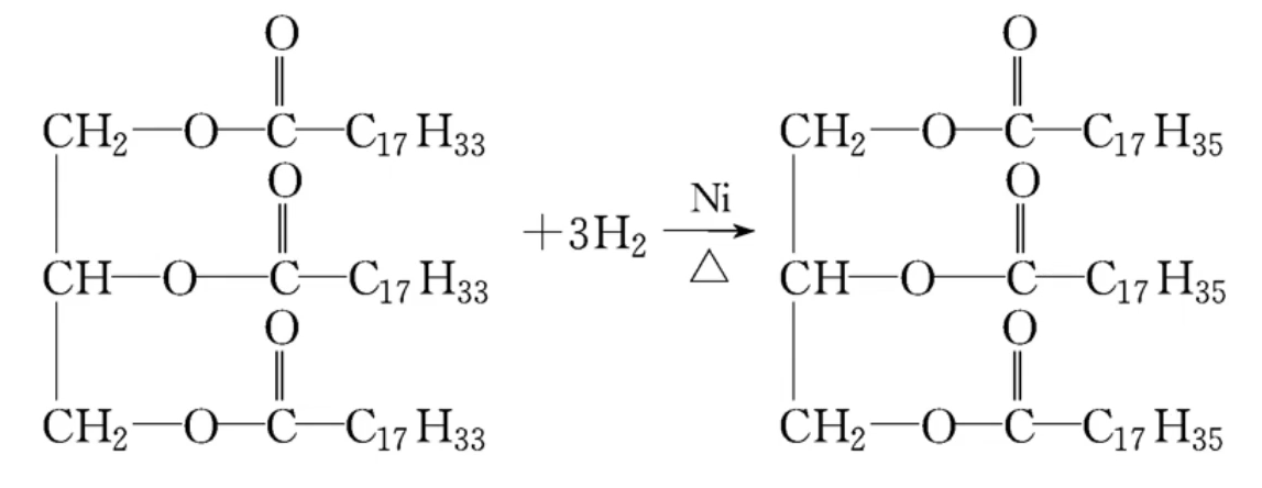 2. 碱性水解:油脂在碱性溶液(如 KOHNaOH 溶液)中水解,生成甘油和高级脂肪酸盐。高级脂肪酸盐常用于生产肥皂,所以油脂在碱性溶液中水解反应又称 皂化反应
