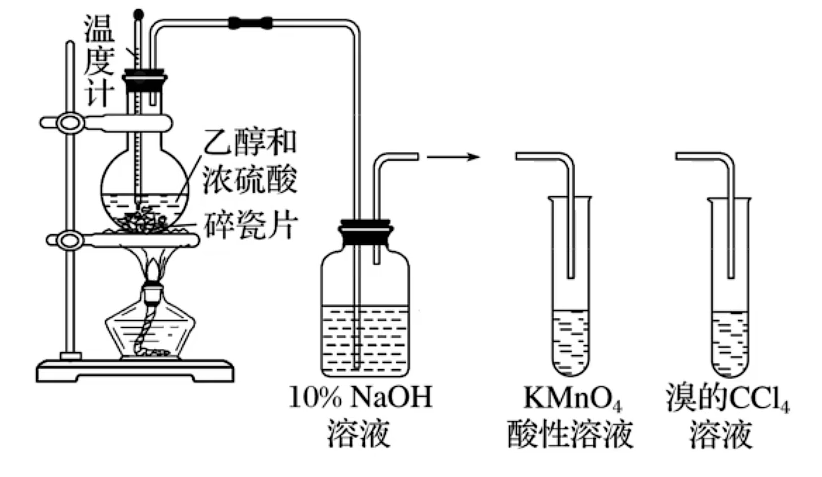 NaOH 溶液除杂:通过导管的不仅有乙烯,还有挥发出来的乙醇,同时浓硫酸发生碳化,碳与浓硫酸再次反应,产生二氧化硫杂质,浓硫酸有强氧化性,生成 COA2 杂质。因此,不能将其不经除杂直接通入 KMnOA4 或 溴水 中验证乙烯具有还原性,乙醇和 SOA2 会使前者褪色, SOA2 会使后者褪色